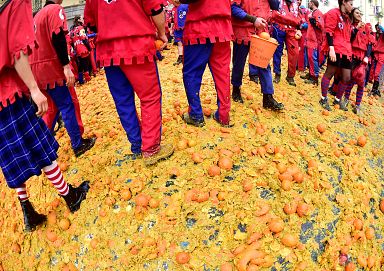 В городе Ивреа на северо-западе Италии во время карнавала проходит проходит знаменитая "апельсиновая битва". Первый раз "апельсиновый" карнавал прошел в 1808 году, однако в его основе лежит средневековая легенда. Согласно этой легенде, местный синьор решил воспользоваться правом "первой ночи", но гордая невеста - дочь мельника - смогла убить тирана. Все жители города поднялись на защиту девушки. В память об этих событиях участники карнавала разбиваются на девять команд и забрасывают друг друга спелыми фруктами.