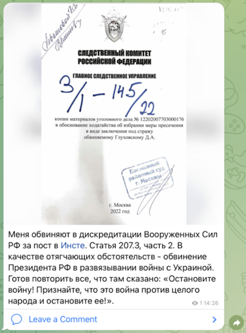 "Моя первая уголовка! ❤️🔥 Меня обвиняют в дискредитации Вооруженных Сил РФ за пост в Инсте. Статья 207.3, часть 2. В качестве отягчающих обстоятельств - обвинение Президента РФ в развязывании войны с Украиной. Готов повторить все, что там сказано: "Остановите войну! Признайте, что это война против целого народа и остановите ее!", - написал Глуховский.