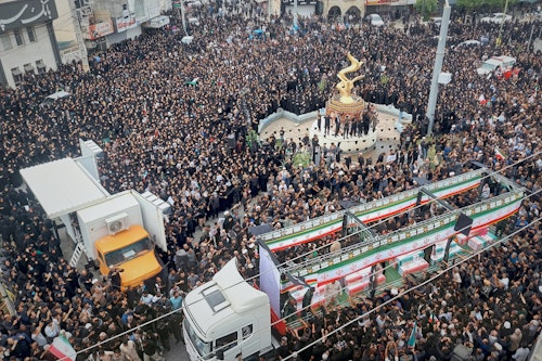 Жители Минаба и официальные лица собрались на похороны погибших в результате, как утверждают иранские власти, израильско-американского удара 28 февраля по начальной школе для девочек, 3 марта 2026 г.